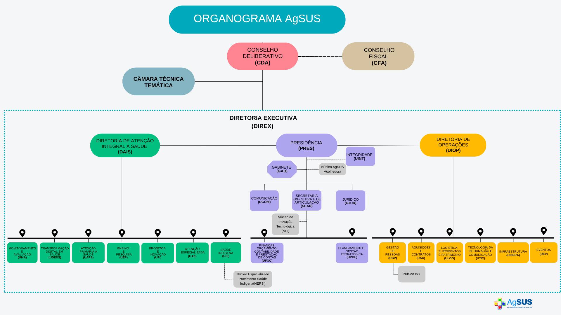 A Agência está em processo de reestruturação desde julho de 2023, com a edição da Lei nº 14.621, quando deixou de ser a Agência para o Desenvolvimento da Atenção Primária à Saúde (Adaps) e passou a ser AgSUS, regulamentada com a instituição do Decreto nº 11.790.